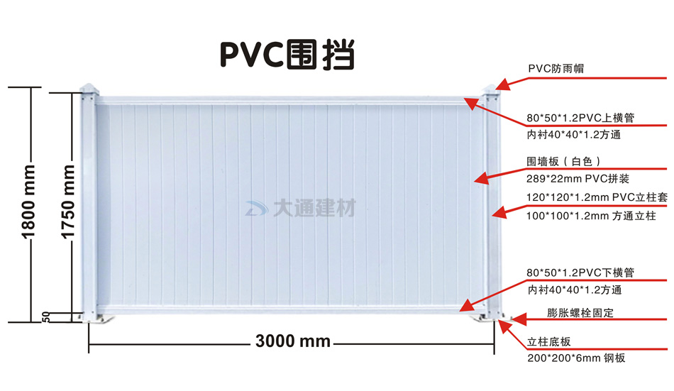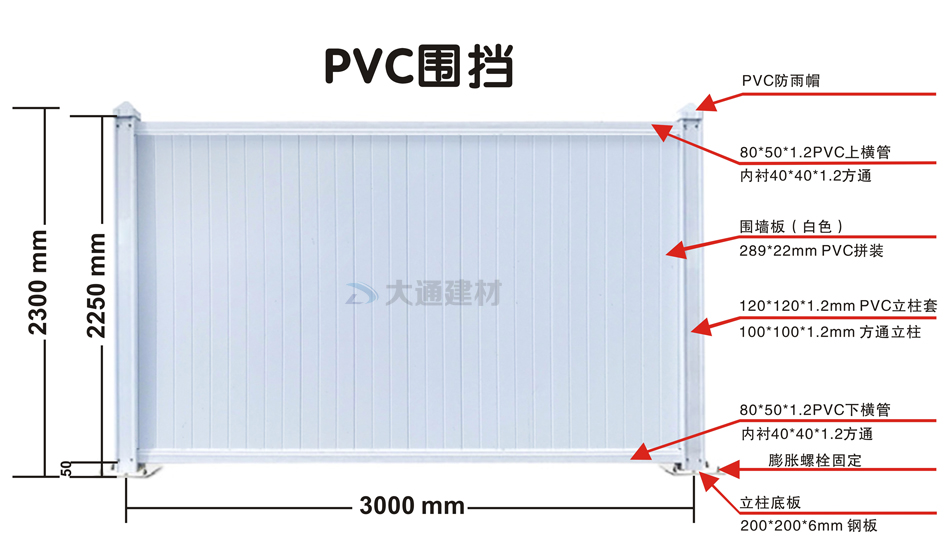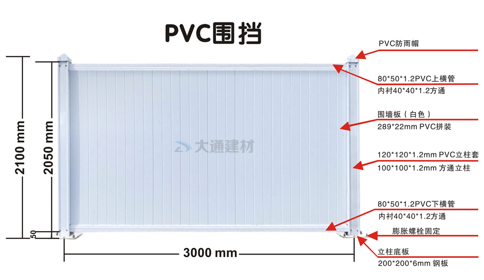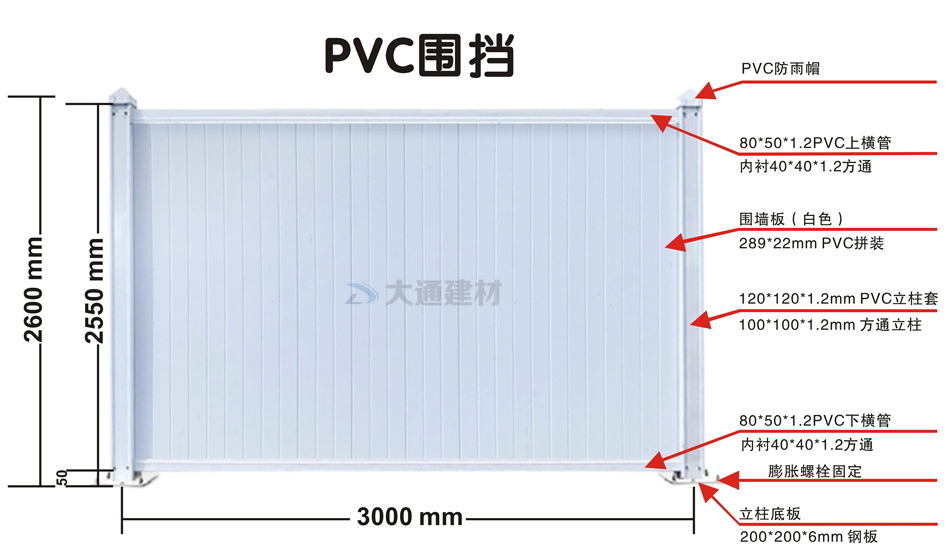 深圳市大通建材白色PVC圍擋的規格尺寸文字描述: